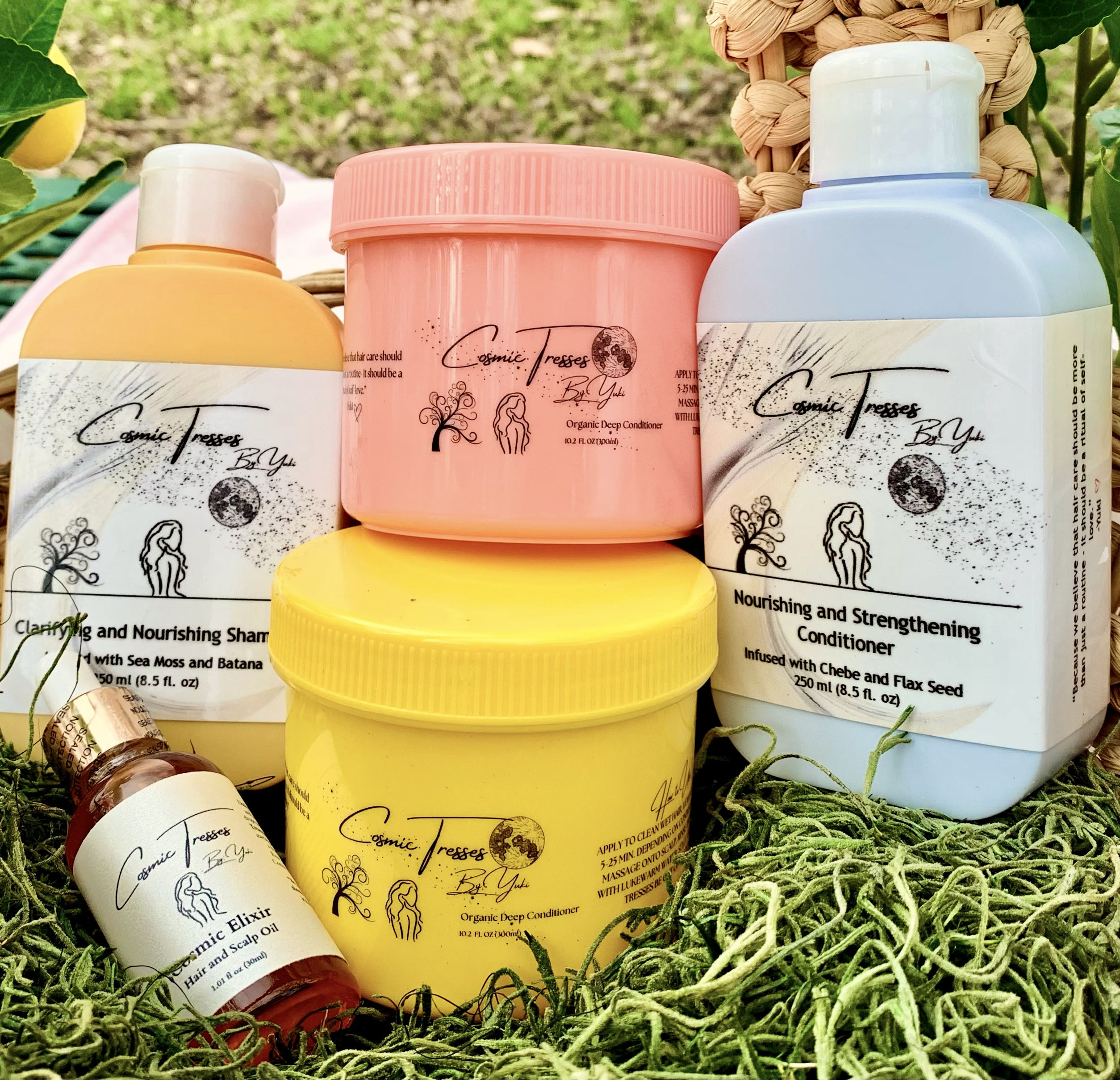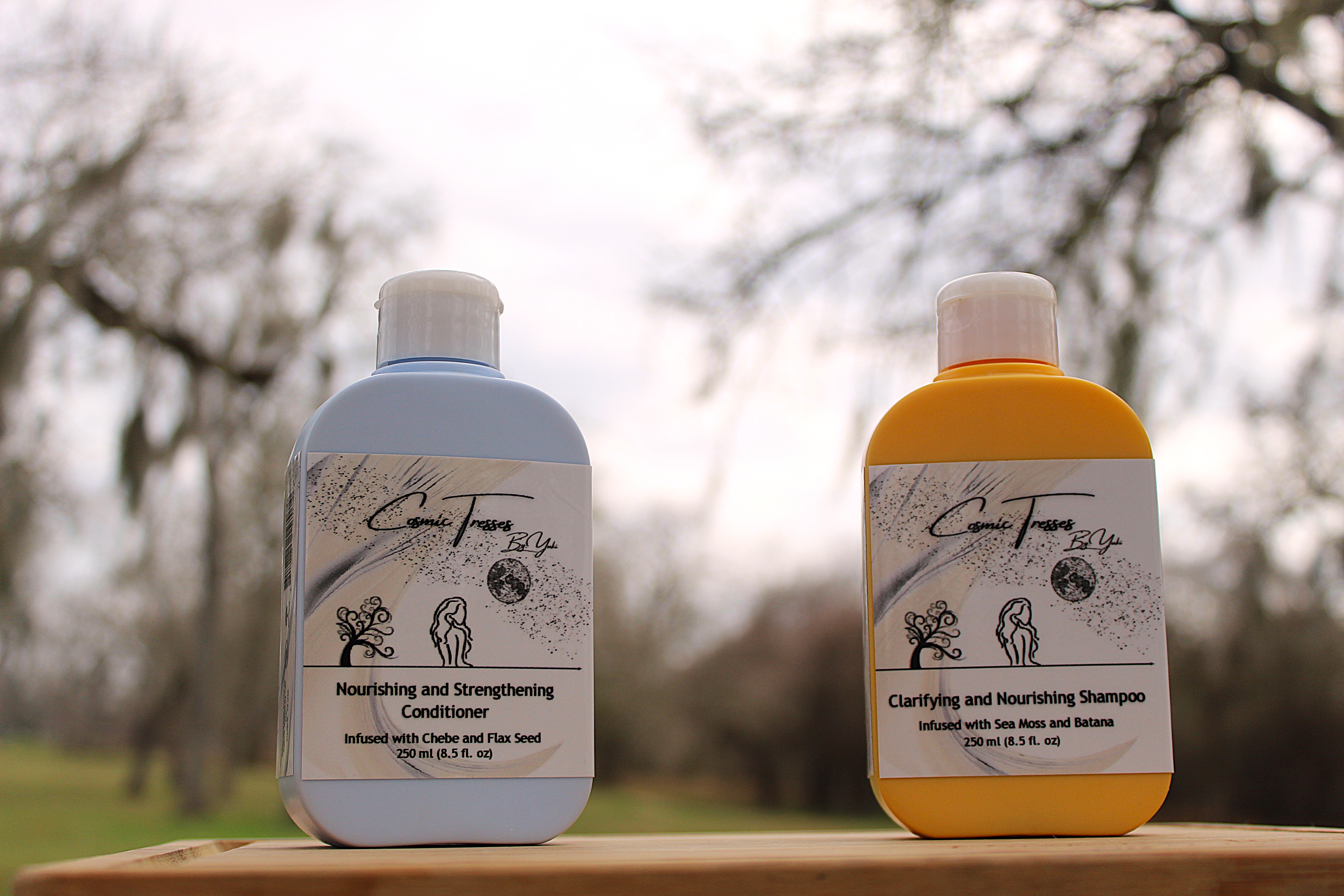 Our Clarifying and Nourishing Shampoo gently cleanses and nourishes the scalp while boosting moisture with a blend of nutrient-rich botanicals. Our formulas are crafted with organic and natural ingredients to promote healthy hair growth and soothe dry itchy scalp. Infused with Sea Moss, Batana, and Moringa for strengthening, repair and healthy hair growth. Our Nourishing and Strengthening Conditioner restores and fortifies dry damaged hair with every use. Crafted with organic and natural ingredients like Chebe, Flax Seed, and Argan to deeply moisturize, strengthen, and nourish hair, promoting growth and reducing breakage. Our formula is designed to leave your tresses feeling stronger, detangled, and visibly healthier. Perfect for, nourishing hair from root to tip for a healthy, vibrant glow. Suitable for all hair types. Free of Silicones, Sulfates, Parabens.